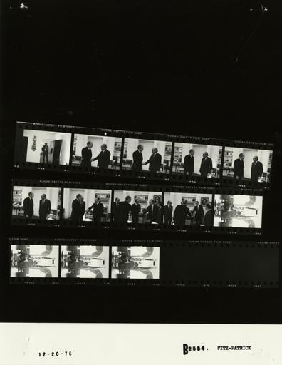 | Keywords: Ford B2554 NLGRF photo contact sheet (1976-12-17)(Gerald Ford Library).jpg White House Photographic Office WHPO is housed at the Gerald R Ford Presidential Library a branch of the National Archives and Records Administration NARA <br/><br/> This file is a 200 dpi photo contact sheet having images from roll of film B2554 of the August 9 1974 - January 20 1977 Gerald R Ford White House Photographic Office Series A0001-A9999 and B0001-B2886 photographs <br/><br/> The date on the photo contact sheet is the date the roll of film was processed not necessarily the date the photographs were taken See table below for additional details 1976-12-17 Gerald R Ford Presidential Library Image http //www fordlibrarymuseum gov/library/whphotos/B2554_NLGRF jpg B2554_NLGRF jpg from http //www fordlibrarymuseum gov/library/whphotos/19761217whpo pdf White House Photographs December 17 1976 of the http //www fordlibrarymuseum gov/Library/whphotos/whpo asp White House Photographic Collection page White House Photographic Office WHPO - Fitz-Patrick PD-USGov Institution Institution Gerald R Ford Presidential Library Table wikitable sortable + Photo contact sheet B2554 U S President Ford Administration Gerald R Ford Library Frame s Tone Subject proper Subject generic Names Geographic Location Photographer Date - 2A BW casually standing in doorway to Oval Office; taken from Oval Office Secret Service Agent Scheduling and Advance Office Fitz-Patrick 1976-12-17 - 3A-7A BW President F Clifton White Associates the Daily Diary only indicates one person at meeting with White -contact sheet has many unidentified men-KGH 08/08/2007 greeting handshaking standing talking GRF Unidentified Man Oval Office Fitz-Patrick 1976-12-17 - 8A-10A BW President F Clifton White Associates the Daily Diary only indicates one person at meeting with White -contact sheet has many unidentified men-KGH 08/08/2007 greeting handshaking standing talking; all not in every frame GRF Unidentified Man Others Oval Office Fitz-Patrick 1976-12-17 - 11A-14A BW posing; one woman seated in chair other standing behind right arm on chair Two Unidentified women Cabinet Room Fitz-Patrick 1976-12-17 Gerald R Ford Presidential Library and Museum-cooperation PD-USGov Contact sheets by the Ford White House December 1976 |