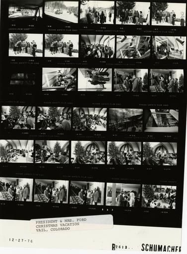 | Keywords: Ford B2613 NLGRF photo contact sheet (1976-12-27)(Gerald Ford Library).jpg  White House Photographic Office WHPO is housed at the Gerald R Ford Presidential Library a branch of the National Archives and Records Administration NARA <br/><br/> This file is a 200 dpi photo contact sheet having images from roll of film B2613 of the August 9 1974 - January 20 1977 Gerald R Ford White House Photographic Office Series A0001-A9999 and B0001-B2886 photographs <br/><br/> The date on the photo contact sheet is the date the roll of film was processed not necessarily the date the photographs were taken See table below for additional details 1976-12-27 Gerald R Ford Presidential Library Image http //www fordlibrarymuseum gov/library/whphotos/B2613_NLGRF jpg B2613_NLGRF jpg from http //www fordlibrarymuseum gov/library/whphotos/19761227whpo pdf White House Photographs December 27 1976 of the http //www fordlibrarymuseum gov/Library/whphotos/whpo asp White House Photographic Collection page White House Photographic Office WHPO - Schumacher PD-USGov Institution Institution Gerald R Ford Presidential Library Table wikitable sortable + Photo contact sheet B2613 U S President Ford Administration Gerald R Ford Library Frame s Tone Subject proper Subject generic Names Geographic Location Photographer Date - 3-4 BW Trip to Colorado - Christmas and Skiing Vacation in Vail CO vehicles parked on either side; 1st frame through windshield of moving vehicle 2nd through rear window People standing on Road Vail CO Snowy Road Schumacher 1976-12-27 - 5-9 BW Trip to Colorado - Christmas Skiing Vacation in Vail CO - Prior to Party at Home of Mr Mrs John Murchison Jr greeting handshaking; standing talking; BF wearing fur coat; various angles and distances; all not in every frame GRF Betty Ford Others Vail CO John Murchison Residence - Outside Schumacher 1976-12-27 - 10-20 BW Trip to Colorado - Christmas Skiing Vacation in Vail CO - Party at Home of Mr Mrs John Murchison Jr standing talking sitting eating; various angles and distances; all not in every frame including GRF and BF GRF Betty Ford Others Vail CO John Murchison Residence Schumacher 1976-12-27 - 21 BW Trip to Colorado - Christmas Skiing Vacation in Vail CO - Party at Home of Mr Mrs John Murchison Jr standing talking; GRF holding paper cup GRF Others Vail CO John Murchison Residence Schumacher 1976-12-27 - 22-23 BW Trip to Colorado - Christmas Skiing Vacation in Vail CO - Party at Home of Mr Mrs John Murchison Jr seated talking near Christmas Tree; more people in background; taken from higher vantage point GRF Betty Ford Pepi Gramshammer Others Vail CO John Murchison Residence Schumacher 1976-12-27 - 24-30 BW Trip to Colorado - Christmas Skiing Vacation in Vail CO - Party at Home of Mr Mrs John Murchison Jr standing talking sitting eating; various angles and distances; all not in every frame including GRF and BF GRF Betty Ford Others Vail CO John Murchison Residence Schumacher 1976-12-27 - 31-32 BW Trip to Colorado - Christmas Skiing Vacation in Vail CO - Party at Home of Mr Mrs John Murchison Jr view of mountains through window Vail CO John Murchison Residence Schumacher 1976-12-27 Gerald R Ford Presidential Library and Museum-cooperation PD-USGov Contact sheets by the Ford White House December 1976 Fur garments Fur fashion in 1976 |