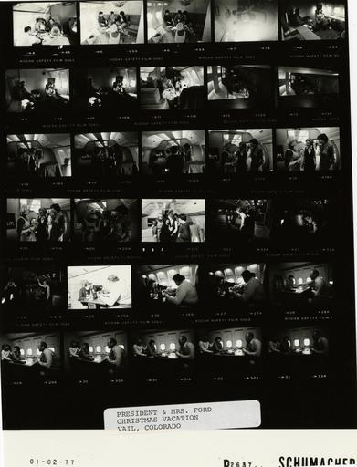 Keywords: Ford B2637 NLGRF photo contact sheet (1977-01-02)(Gerald Ford Library).jpg White House Photographic Office WHPO is housed at the Gerald R Ford Presidential Library a branch of the National Archives and Records Administration NARA <br/><br/> This file is a 200 dpi photo contact sheet having images from roll of film B2637 of the August 9 1974 - January 20 1977 Gerald R Ford White House Photographic Office Series A0001-A9999 and B0001-B2886 photographs <br/><br/> The date on the photo contact sheet is the date the roll of film was processed not necessarily the date the photographs were taken See table below for additional details 1977-01-02 Gerald R Ford Presidential Library Image http //www fordlibrarymuseum gov/library/whphotos/B2637_NLGRF jpg B2637_NLGRF jpg from http //www fordlibrarymuseum gov/library/whphotos/19770102whpo pdf White House Photographs January 2 1977 of the http //www fordlibrarymuseum gov/Library/whphotos/whpo asp White House Photographic Collection page White House Photographic Office WHPO - Schumacher PD-USGov Institution Institution Gerald R Ford Presidential Library Table wikitable sortable + Photo contact sheet B2637 U S President Ford Administration Gerald R Ford Library Frame s Tone Subject proper Subject generic Names Geographic Location Photographer Date - 4 BW Trip to Colorado - Return Flight from Grand Junction CO to Andrews Air Force Base MD seated at table; documents on table; Barrett's back to camera; Scowcroft talking to woman who is peeking between seats Cavanaugh Raoul-Duval Scowcroft Barret; Unidentified Woman Barbara Rippie Air Force One Schumacher 1977-01-02 - 5-7 BW Trip to Colorado - Return Flight from Grand Junction CO to Andrews Air Force Base MD three \wwomen seated on sofa Susan kneeling on floor back to camera smoking cigarette Nancy Chirdon Weidenfeld Unidentified Woman Susan Ford Air Force One - President's Cabin Schumacher 1977-01-02 - 8-10 BW Trip to Colorado - Return Flight from Grand Junction CO to Andrews Air Force Base MD seated talking Sen Mrs John Glenn Air Force One Schumacher 1977-01-02 - 11 BW Trip to Colorado - Return Flight from Grand Junction CO to Andrews Air Force Base MD seated at table; Barrett reading Cavanaugh on telephone Raoul-Duval in foreground back to camera Barrett Cavanaugh Raoul-Duval Air Force One Schumacher 1977-01-02 - 12-13 BW Trip to Colorado - Return Flight from Grand Junction CO to Andrews Air Force Base MD looking down aisle od main passenger cabin; Gramshammer seated in foreground others seated farther back Sheika Gramshammer Others Air Force One Schumacher 1977-01-02 - 14-21 BW Trip to Colorado - Return Flight from Grand Junction CO to Andrews Air Force Base MD stansding in aisle laughing talking; various angles and distances; all not in every frame Betty Ford Nancy Chirdon Sheika Gramshammer Susan Ford Weidenfeld Air Force One Schumacher 1977-01-02 - 22-24 BW Trip to Colorado - Return Flight from Grand Junction CO to Andrews Air Force Base MD BF standing in aisle talking to Frances Lewine not seen in frame; Growald seated across from Lewine Betty Ford Dick Growald Others Air Force One Schumacher 1977-01-02 - 25-27 BW Trip to Colorado - Return Flight from Grand Junction CO to Andrews Air Force Base MD seated at table working; tape recorders on table Phil Jones Frances Lewine Dick Growald Air Force One Schumacher 1977-01-02 - 28-33 BW Trip to Colorado - Return Flight from Grand Junction CO to Andrews Air Force Base MD seated talking laughing; various distances GRF Kira Gramshammer Sheika Gramshammer Air Force One Schumacher 1977-01-02 Gerald R Ford Presidential Library and Museum-cooperation PD-USGov Contact sheets by the Ford White House January 1977 |