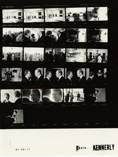 | Keywords: Ford B2879 NLGRF photo contact sheet (1977-01-20)(Gerald Ford Library).jpg White House Photographic Office WHPO is housed at the Gerald R Ford Presidential Library a branch of the National Archives and Records Administration NARA <br/><br/> This file is a 200 dpi photo contact sheet having images from roll of film B2879 of the August 9 1974 - January 20 1977 Gerald R Ford White House Photographic Office Series A0001-A9999 and B0001-B2886 photographs <br/><br/> The date on the photo contact sheet is the date the roll of film was processed not necessarily the date the photographs were taken See table below for additional details 1977-01-20 Gerald R Ford Presidential Library Image http //www fordlibrarymuseum gov/library/whphotos/B2879_NLGRF jpg B2879_NLGRF jpg from http //www fordlibrarymuseum gov/library/whphotos/19770120whpo pdf White House Photographs January 20 1977 of the http //www fordlibrarymuseum gov/Library/whphotos/whpo asp White House Photographic Collection page White House Photographic Office WHPO <br/> Creator David Hume Kennerly PD-USGov Institution Institution Gerald R Ford Presidential Library Table wikitable sortable + Photo contact sheet B2879 U S President Ford Administration Gerald R Ford Library Frame s Tone Subject proper Subject generic Names Geographic Location Photographer Date - 3-5 BW Prior to Final Departure From White House - Transition from White House handshaking; servants and ushers in long row; long shots; table on right of frames GRF White House Ushers Support staffs State Dining Room Kennerly 1977-01-20 - 6 BW Arrival for Reception for Jimmy and Rosalynn Carter and Walter and Joan Mondale walking toward doorway; Rhodes holding Happy's arm; media on either side Rep Rhodes Happy Rockefeller Rockefeller Sen Hatfield; Media North Portico Kennerly 1977-01-20 - 7-8 BW Arrival for Reception for Jimmy and Rosalynn Carter and Walter and Joan Mondale walking toward doorway; media on either side Jimmy Carter Rosalynn Carter Sen Cannon Rep O'Neill; Media North Portico Kennerly 1977-01-20 - 9-10 BW Arrival for Reception for Jimmy and Rosalynn Carter and Walter and Joan Mondale GRF and Carter handshaking; Rosalynn in background GRF Jimmy Carter Rosalynn Carter North Portico Kennerly 1977-01-20 - 11-12 BW Arrival for Reception for Jimmy and Rosalynn Carter and Walter and Joan Mondale backs to camera posing for media; taken from Entrance Hall/Grand Hall GRF Betty Ford Jimmy Carter Rosalynn Carter; Media North Portico Kennerly 1977-01-20 - 13-14 BW Arrival for Reception for Jimmy and Rosalynn Carter and Walter and Joan Mondale turning to enter Entrance Hall/Grand Hall GRF Betty Ford Jimmy Carter Rosalynn Carter North Portico Kennerly 1977-01-20 - 15 BW Arrival for Reception for Jimmy and Rosalynn Carter and Walter and Joan Mondale NAR handshaking with Rosalynn Carter; others standing watching GRF Betty Ford Jimmy Carter Rosalynn Carter Rockefeller Sen Cannon Rep O'Neill Others Entrance Hall/Grand Hall Kennerly 1977-01-20 - 16 BW Reception for Jimmy and Rosalynn Carter and Walter and Joan Mondale standing talking in center of room GRF Rosalynn Carter Blue Room Kennerly 1977-01-20 - 17-18 BW Reception for Jimmy and Rosalynn Carter and Walter and Joan Mondale standing talking in center of room Rosalynn's back to camera in 1st frame; various distances GRF Rosalynn Carter Jimmy Carter Blue Room Kennerly 1977-01-20 - 19-22 BW Reception for Jimmy and Rosalynn Carter and Walter and Joan Mondale standing talking; close up profile portraits; turning away from camera in last frame GRF Jimmy Carter Blue Room Kennerly 1977-01-20 - 23 BW Reception for Jimmy and Rosalynn Carter and Walter and Joan Mondale standing talking; close up portrait; Carter sipping coffee GRF's back to camera GRF Jimmy Carter Blue Room Kennerly 1977-01-20 - 24-25 BW Reception for Jimmy and Rosalynn Carter and Walter and Joan Mondale standing talking; close up portraits; GRF's back to camera GRF Jimmy Carter Blue Room Kennerly 1977-01-20 - 26 BW Reception for Jimmy and Rosalynn Carter and Walter and Joan Mondale talking in groups; GRF and Carter in background Sen Hatfield Happy Rockefeller GRF Jimmy Carter Blue Room Kennerly 1977-01-20 - 27-28 BW Reception for Jimmy and Rosalynn Carter and Walter and Joan Mondale standing talking backs to camera; taken from low vantage point; oval of ceiling visible GRF Jimmy Carter Blue Room Kennerly 1977-01-20 Gerald R Ford Presidential Library and Museum-cooperation PD-USGov Contact sheets by the Ford White House January 1977 Photographs by David Hume Kennerly from 1977 |
