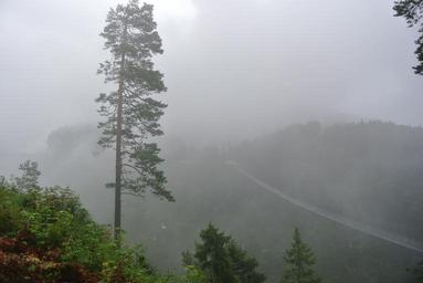 Keywords: forest bridge fog gloomy trees forests nature landscape mountains of course landscapes lichtspiel meadow hanging rope bridge mood green shadow atmosphere flora raindrop dew flowers morning plant drop of water rain