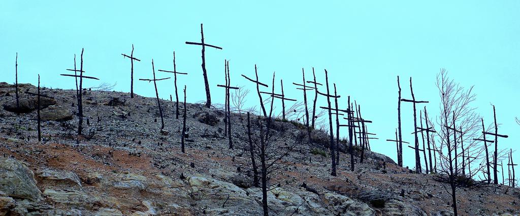 Keywords: forest fire burnt mountain degradation death artistic crosses firewood burned