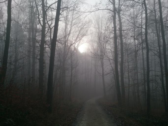 Keywords: forest fog autumn forest path colourless back light mood