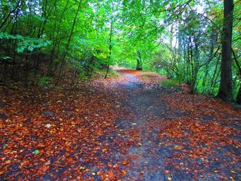 Keywords: forest pathway trees outdoors environment foliage natural scenic scenery woods leaves