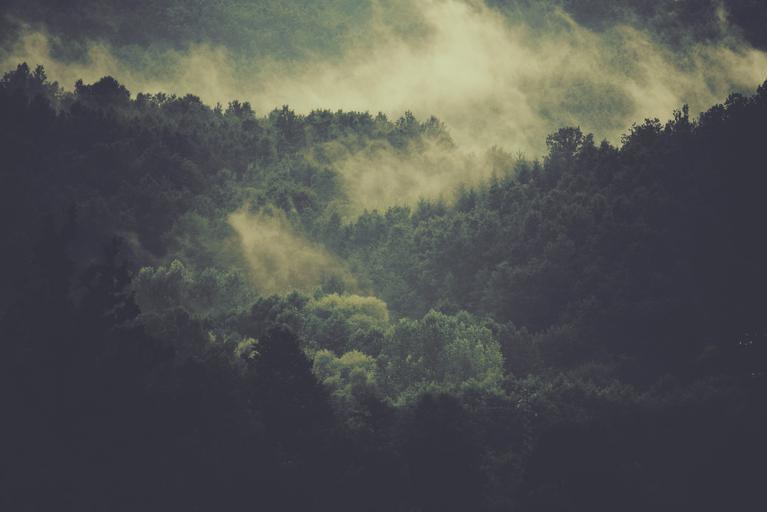 Keywords: forest trees fog clouds mist nature environment wood landscape outdoor view mystic atmospheric scenic wilderness woodland