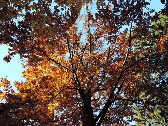 Keywords: forest trees treetops heaven light autumn colors colored leaves branches beech sun