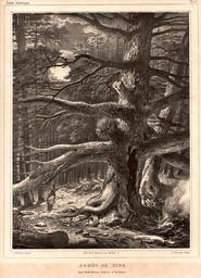 Keywords: Forêt de pins.jpg es Litografía nº 42 del libro Histoire naturelle des îles Canaries 1 2 Les Miscellanées Canariennes Planches De Phillip Barker Webb y Sabin Berthelot En el grabado se observa un pinar de pino canario en la isla de La Palma durante la luna llena En el fondo a la izquierda se ve a un leñador talando un pino mientras que en la derecha se observa a otro durmiendo junto a una hoguera con un sombrero tapando su cara y envuelto en una capa Own archive C Adrien 1839 PD-old-100 Pinus canariensis