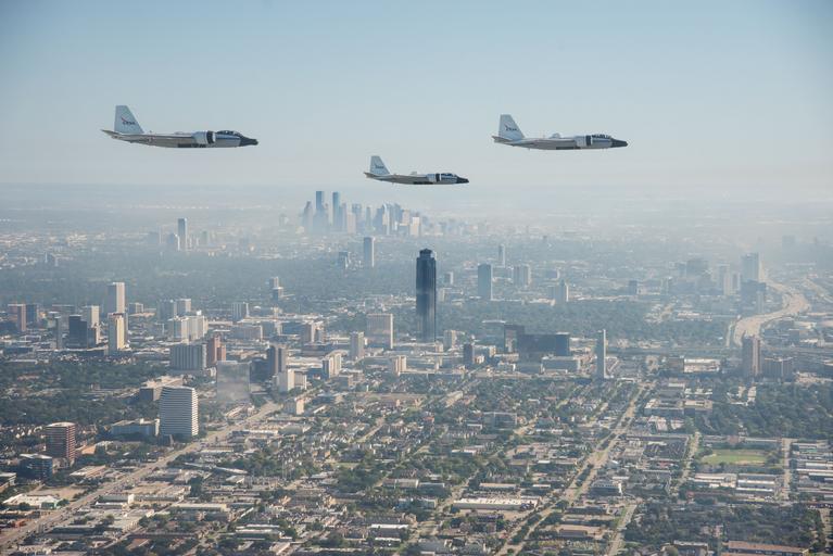 Keywords: NASA three WB-57s fly aircraft foggy downtown Houston Texas historic formation flight