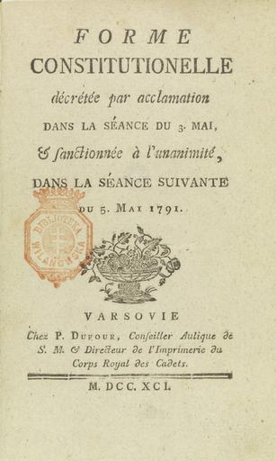 Keywords: Forme constitutionelle de la Pologne - Varsovie 1791 - Piotr Dufour.jpg en Polish-Lithuanian Commonwealth's Constitution of the 3rd May 1791 in French language - printed in Warszawa city by Piotr Dufour 1791 AD ru Пе вая ст аница ф анкоязычного издания Конституции 3 мая 1791 г п инятой сеймом Речи Посполитой Печатник Пет Дюфо го од Ва шава Польша Издание 1791 г be Пе шая ста онка ф анкамоўнага выдання Канстытуцыі 3 мая 1791 г п ынятай соймам Рэчы Паспалітай Д ука Пёт Дзюфо го ад Ва шава Польшча Д ук 1791 г http //polona pl/item/4186977/4/ - free polish digital library Piotr Dufour 1730-1797 printer 1791 Constitution of the 3rd May 1791 PD-old-100 |