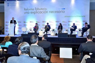 | Keywords: La difícil coyuntura económica generada por la caída en los precios del petróleo y la caída de la inversión, entre otros factores, llevó a la necesidad de plantear una reforma tributaria estructural para aumentar el recaudo. Para profundizar y debatir sobre el proyecto presentado por el Gobierno Nacional ante el Congreso de la República, la Fundación Buen Gobierno y la Cámara de Comercio de Bogotá adelantaron este foro con la presencia del Ministro de Hacienda y el director de la DIAN. Expertos tributaristas y representantes de gremios ante más de mil asistentes, debatieron el tema y dieron luces sobre la conveniencia de la reforma. /Crédito CCB. cámara de comercio bogotá |