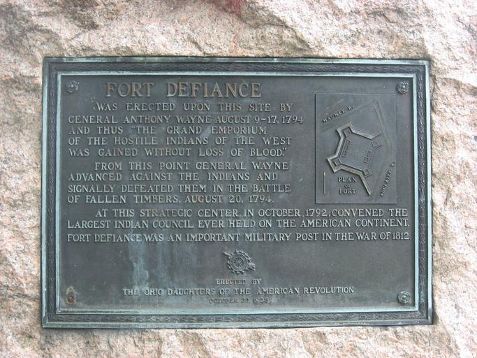 | Keywords: Fort Defiance historical marker.jpg 41 17 15 N 84 21 25 W Historical marker placed by the w Daughters of the American Revolution at the site of Fort Defiance Ohio Fort Defiance located atop a bluff overlooking the confluence of the Auglaize River Auglaize and Maumee River Maumee Rivers in Defiance Ohio Defiance Ohio United States Built in 1794 the fort served as U S Army headquarters before the Battle of Fallen Timbers Today the fort site is a park; it is listed on the National Register of Historic Places Own 2010-07-31 User Nyttend Nyttend Plaque and photo respectively PD-US-no notice Daughters of the American Revolution monuments and memorials Fort Defiance Historical markers in Ohio Plaques referencing 1794 Plaques referencing 1925 Signs by User Nyttend |