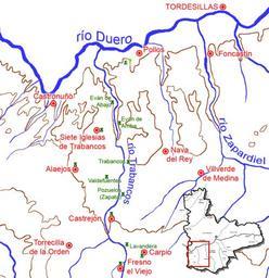 | Keywords: Fortalezas del Trabancos.gif Distribución de las fortalezas medievales de la frontera entre los reinos de Castilla y de León en el siglo XII Valladolid España Citado en MAÑANES T y VALBUENA F 1977 Torres y fortalezas medievales al sur del Duero en la provincia de Valladolid Boletín del seminario de Arte y Arqueología volumen XLIII Editado por la Universidad de Valladolid Páginas 111-126 own 2006-02 José-Manuel Benito Locutus Borg Trabancos River Maps of archaeological sites in Spain Fortresses Castles in the province of Valladolid Maps of the history of Spain Maps of the province of Valladolid Alaejos Maps in Spanish |