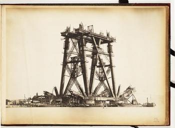 Keywords: Forth Bridge - Fife from Village Pier (west side).jpg Photograph of Fife from Village Pier west side The riveting cages alluded to in the preceding picture can here again be seen on both the bottom members which were carried out to a distance of about 100 feet without any external support The upper ends of verticals are rapidly nearing each other which accounts for the lengths of box girder projecting on either side the shortening of which has already commenced as is evident from the eastern arm of same Transcription from Philip Phillips 'The Forth Railway Bridge' Edinburgh 1890 Size cm 43 58 exhibition history Institution National Library of Scotland photograph object history PD-old-70-1923 Creator Philip Phillips RB l 229 74570338 Forth Bridge - Fife from Village Pier west side Uploaded with GWToolset Forth Bridge - Fife from Village Pier west side http //deriv nls uk/56YK98Q/7443/74438668 2 jpg Construction of the Forth Bridge Images uploaded as part of NLS-WMUK collaboration |