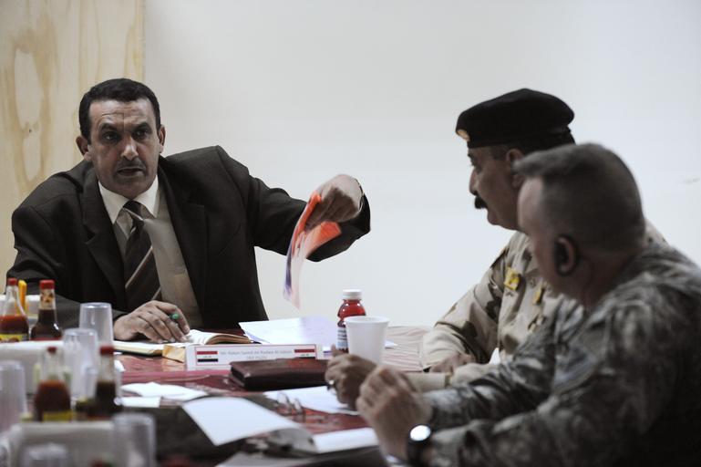 Keywords: Forward Operating Base Warrior Hosts Sons of Iraq Transition Meeting DVIDS261395.jpg en Rakan Saeed Ali Radwa Al-Jubori deputy governer Kirkuk Iraq speaks to U S and Iraqi leaders during the Sons of Iraq Transition Meeting at Forward Operating Base Warrior in Kirkuk Iraq March 18 Leaders from the U S Army Iraqi army and Iraqi police met to discuss how to help those currently serving in the Sons of Iraq transition to other security forces or positions were they can continue to serve their country 2010-03-18 Petty Officer 1st Class matthew leistikow https //www dvidshub net/image/261395 100318-N-+++++-014 2010-03-19 19 35 KIRKUK IQ PD-USGov-Military-Navy Forward Operating Base Warrior Sons of Iraq Images from DoD uploaded by Fæ |