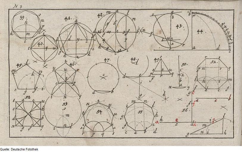 Keywords: Fotothek df tg 0000220 Geometrie ^ Planimetrie ^ Proportion ^ Kreis ^ Polygon ^ Instrument.jpg Scan Deutsche Fotothek df_tg_0000220 color 2007 MIK-Center Berlin GmbH 88960220 Abbildung Nr 3 Nürnberg Proportionale Kreis- und Streckenteilung und Konstruktion von Polygonen mit dem Zirkel Papier Kupferstich 8 7 x 14 5 cm Geometrie Planimetrie Proportion Kreis Polygon Instrument ppn263671577 1687 Druck Deutsche Fotothek gefördert von der Deutschen Forschungsgemeinschaft Projekt Technikgeschichte 16 /17 Jh Verwalter Dresden Sächsische Landesbibliothek - Staats- und Universitätsbibliothek Dresden 3 A 8395 Herstellung Herstellung Riegel Christoph Knorz Andreas Verleger aus Stahl Georg Conrad Buch Georg Conrad Martii neu-aufgeführter Europäischer Ingenieur oder Kriegs-Bau-Kunst Wie solche mit allem was dazu erfordert wird in Europa üblich gewesen und zumaln annoch ist In sich haltend I Eine vollständige Geometrie II Eine ausführliche Fortification nemlich von Offensiv- und Defensiv-Wercken auch andern Militair-Gebäuden auf aller Europäischen Völcker Art vorgestellt und mit nöthigen Kupffern versehen Das IV Capitel Von Theilungen der Circular-Linie/ oder/ worauf es folglich zu ziehen/ von Aufreissung der Polygonal oder vielseitigen Figur Das V Capitel Von Aufreissung der Polygona-oder vieleckigten Figuren auf dazu gegebene Seiten Das VI Capittel Von Proportionirung der Linien gegen einander SLUB 3 A 8395 Fotothek-License PD-old-100 Old Manuscripts from the Deutsche Fotothek Geometrie Stereometrie Körper |