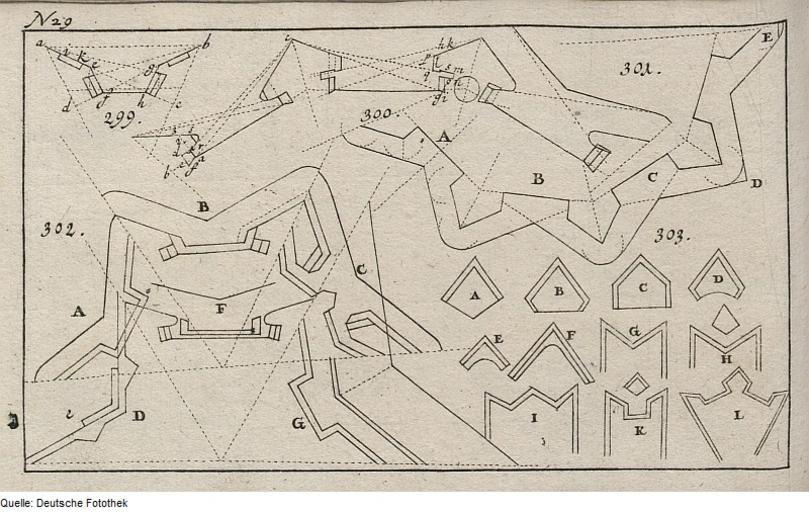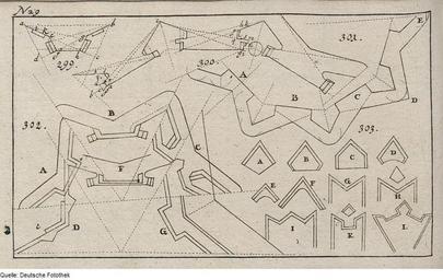 | Keywords: Fotothek df tg 0000246 Geometrie ^ Architektur ^ Festungsbau ^ Festungsgraben ^ Bollwerk ^ Ravelin.jpg Scan Deutsche Fotothek df_tg_0000246 color 2007 MIK-Center Berlin GmbH 88960246 Abbildung Nr 29 Nürnberg Konstruktion von Festungsgrundrissen mit Hilfe von verschiedenen Winkeltabellen Konstruktion von Kasemattengrundrissen Grundriss der Außenwerke Wall Graben Face einer Festung Grundrisse von Ravelins Halbmonden Zangen und Hornwerk Papier Kupferstich 8 7 x 14 5 cm Geometrie Architektur Festungsbau Festungsgraben Bollwerk Ravelin ppn263671577 1687 Druck Deutsche Fotothek gefördert von der Deutschen Forschungsgemeinschaft Projekt Technikgeschichte 16 /17 Jh Verwalter Dresden Sächsische Landesbibliothek - Staats- und Universitätsbibliothek Dresden 3 A 8395 Herstellung Herstellung Riegel Christoph Knorz Andreas Verleger aus Stahl Georg Conrad Buch Georg Conrad Martii neu-aufgeführter Europäischer Ingenieur oder Kriegs-Bau-Kunst Wie solche mit allem was dazu erfordert wird in Europa üblich gewesen und zumaln annoch ist In sich haltend I Eine vollständige Geometrie II Eine ausführliche Fortification nemlich von Offensiv- und Defensiv-Wercken auch andern Militair-Gebäuden auf aller Europäischen Völcker Art vorgestellt und mit nöthigen Kupffern versehen Das V Capitel Vom Aufreisen der Planten aufs Papier/ Item von Auftragung deroselben aufs Feld aus denen darzu gerechneten Tabellen unterschiedlicher Ingenierurn Das VI Capitel Von Aufreissen der Casamaten/ nach der Frantzösischen und er gleichen Fortificationen/ dabey selbige noch im Gebrauch sind Das VII Capitel Von fernerer Zugehör derer Vestungen/ die theils an allen/ als ein Essential-Stück sind/ theils nach und nach darzu gethan/ und unterschiedlich angegben werden als dem Graben/ der Faussebraye dem bedeckten Weg oder Contrescarpe; auch von Aussen-Wercken insgemein Das VII Capitel Von Aussen-Wercken in specie das ist/ von allerhand Ravelinen/ halben Monden/ Contraguarden Tenaillen Horn- und Corn-Wercken/ sowohl nach der courantesten Holländischen und Französischen Manier/ als auch nach den heut-tägigen Verbesserungen unterschiedlicher Ingenieurs SLUB 3 A 8395 Fotothek-License PD-old-100 Kriegs-Bau-Kunst Georg Conrad Stahl Old Manuscripts from the Deutsche Fotothek Castrametation |