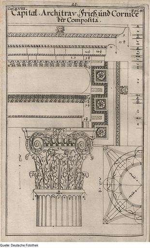 | Keywords: Fotothek df tg 0001637 Architektur ^ Bauwesen ^ Säule ^ Kapitell ^ Kompositordnung.jpg Scan Deutsche Fotothek df_tg_0001637 color 2007 MIK-Center Berlin GmbH 88961637 Kap 18 Fig 21 Bl 45 Nürnberg Kapitell Architrav Fries und Karnies der Säule der Kompositordnung Papier Kupferstich 31 7 x 19 cm Architektur Bauwesen Säule Kapitell Kompositordnung ppn26553190X 1698 Druck Deutsche Fotothek gefördert von der Deutschen Forschungsgemeinschaft Projekt Technikgeschichte 16 /17 Jh Verwalter Dresden Sächsische Landesbibliothek - Staats- und Universitätsbibliothek Dresden Archit 188 Herstellung Herstellung Endter Verleger aus Palladio Andreas Böckler Georg Andreas Hrsg Buch Die Baumeisterin Pallas Oder Der in Teutschland entstandene Palladius das ist Des vortrefflich-Italiänischen Baumeisters Andreae Palladii Zwey Bücher Von der Baukunst Deren Erstes I Von denen Materialien die zu dem Bauen insgemein gehören Das Zweyte tractiret I Von denen Zierrathen der gemeinen Gebäue Das XVIII Capitel Von dem Ordine Composito SLUB Archit 188 Fotothek-License PD-old-100 Scans Old Manuscripts from the Deutsche Fotothek |