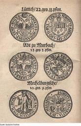 | Keywords: Fotothek df tg 0002017 Geldwesen ^ Münzwesen ^ Münze ^ Taler.jpg  Scan Deutsche Fotothek df_tg_0002017 color 2007 MIK-Center Berlin GmbH 88962017 12v XII v Dresden Taler des Bischofs Robert von Lüttich; Taler des Abtes Johann Rudolf von Murbach; Taler des Herzogs von Mecklenburg Papier Holzschnitt 16 x 9 2 cm Geldwesen Münzwesen Münze Taler ppn265983878 1571 Druck Deutsche Fotothek gefördert von der Deutschen Forschungsgemeinschaft Projekt Technikgeschichte 16 /17 Jh Verwalter Dresden Sächsische Landesbibliothek - Staats- und Universitätsbibliothek Dresden Hist Sax M 192 Herstellung Stöckel Verleger aus August Sachsen Kurfürst Buch Des Churfürsten zu Sachsen und Burggraffen zu Magdeburg etc Ausschreiben Gebot unnd Vorbot die Müntz anlangende nach inhalt des H Reichs Müntzordnung und derowegen auffgerichteter Abschiede Anno M D LXXI den 22 Decembris Nachfolgende Taler seind mehr nicht werdt/ dann wie uber ein jedern vorzeichent SLUB Hist Sax M 192 Fotothek-License PD-old-100 Scans Coins of the Holy Roman Empire Des Churfürsten zu Sachsen und Burggraffen zu Magdeburg etc Ausschreiben 1571 Old Manuscripts from the Deutsche Fotothek Coins Derivatives of the Coat of arms of Murbach Abbey |