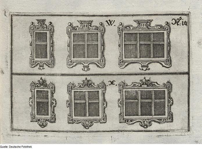 Keywords: Fotothek df tg 0002972 Architektur ^ Fenstereinfassung ^ Fensterrahmen ^ Fenster ^ Gesims.jpg Scan Deutsche Fotothek df_tg_0002972 color 2007 MIK-Center Berlin GmbH 88962972 zwischen S 30 und 31 Blatt Nr 10 Augsburg Fenstereinfassungen unterhalb des Dachgesimses und Verkleidungen Papier Kupferstich 8 8 x 13 cm Architektur Fenstereinfassung Fensterrahmen Fenster Gesims ppn266930085 1667 Druck Deutsche Fotothek gefördert von der Deutschen Forschungsgemeinschaft Projekt Technikgeschichte 16 /17 Jh Verwalter Dresden Sächsische Landesbibliothek - Staats- und Universitätsbibliothek Dresden Archit 595-8/9 misc 2 Herstellung Schultes Johann Drucker Herstellung Furttenbach Joseph der Jüngere Kupferstecher aus Furttenbach Joseph Buch Allgemeine deutsche Baukunst Garten-Pallästlins-Gebäw; Der Neundte Theil; in welchem gar umständlich zu vernehmen wie ein Lust- Sommer- oder Villa-Haus im freyen Feld dastehend einem Garten-Pallästlin zu vergleichen auch mancherley feinen Architectonischen mit geringen Unkosten in das Werck selbsten zustellenden albereit experimentirten liebreichen Zieraden köndte aufgebauet und alsdann zu Nutzen und Recreation möge gebraucht und gaudirt werden Von den Fenster-Gerichter Das Kupfferblat N 10 SLUB Archit 595-8/9 misc 2 Fotothek-License PD-old-100 Joseph Furttenbach d J Old Manuscripts from the Deutsche Fotothek