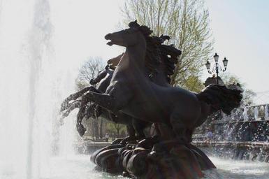 Keywords: fountain alexander gardens moscow statue of four wild horses water spraying movement portrayed statue zurab tsereteli russian black near kremlin day time outside
