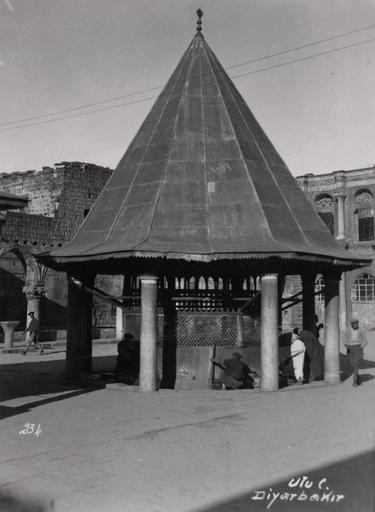 | Keywords: diyarbakır ulu camii diyarbakırulucamii great mosque of diyarbakır greatmosqueofdiyarbakır avlu courtyard şadırvan ablution fountain ablutionfountain mimari architecture diyarbakır salt araştırma saltaraştırma salt research saltresearch salt online saltonline blackandwhite outdoor black and white www.archives.saltresearch.org/R/-?func=dbin-jump-full&amp...  Diyarbakır Ulu Camii’nin avlusundaki şadırvan  “639 yılında, Hz. Ömer’in halifeliği döneminde, Diyarbakır’a egemen olan Müslüman Araplar tarafından yaptırılmıştır. Önceden Mar Thoma Kilisesi olan Ulu Cami, Anadolu’nun bilinen en eski camisidir. Erken İslam Dönemi’nin ünlü Şam Emeviye Camii’nin Anadolu’ya yansıması olarak yorumlanır. Farklı dönemlerde yapılan onarım ve eklentilerle bugünkü şeklini almıştır. Hanifiler bölümü, Şafiiler bölümü, Mesudiye Medresesi ve Zinciriye Medresesi’nden oluşan bir yapılar grubudur. Avlu cephelerindeki farklı dönemlere ait mimari bezemeler, kabartma ve yazıtlar büyük bir uyum içerisinde yerleştirilmiştir.”    Kaynak: Ayşe Üçok, “Güneydoğu Anadolu Rehberi: Uygarlığın Öyküsü”, Gaziantep Ticaret Odası, 2007.  SALT Araştırma - Ali Saim Ülgen Arşivi www.archives.saltresearch.org/R/-?func=dbin-jump-full&amp...  Diyarbakır Ulu Camii’nin avlusundaki şadırvan  “639 yılında, Hz. Ömer’in halifeliği döneminde, Diyarbakır’a egemen olan Müslüman Araplar tarafından yaptırılmıştır. Önceden Mar Thoma Kilisesi olan Ulu Cami, Anadolu’nun bilinen en eski camisidir. Erken İslam Dönemi’nin ünlü Şam Emeviye Camii’nin Anadolu’ya yansıması olarak yorumlanır. Farklı dönemlerde yapılan onarım ve eklentilerle bugünkü şeklini almıştır. Hanifiler bölümü, Şafiiler bölümü, Mesudiye Medresesi ve Zinciriye Medresesi’nden oluşan bir yapılar grubudur. Avlu cephelerindeki farklı dönemlere ait mimari bezemeler, kabartma ve yazıtlar büyük bir uyum içerisinde yerleştirilmiştir.”    Kaynak: Ayşe Üçok, “Güneydoğu Anadolu Rehberi: Uygarlığın Öyküsü”, Gaziantep Ticaret Odası, 2007.  SALT Araştırma - Ali Saim Ülgen Arşivi |