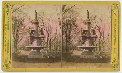 Keywords: philadelphia pennsylvania fountain society drinking fountains drinkingfountains rittenhouse square rittenhousesquare stereographs hand-colored handcolored albumen prints linkwoodward stereoscopic co. linkwoodwardstereoscopicco rochester new york newyork drawing photo border View in Rittenhouse Square shows an ornate drinking fountain adorned by a column with sea horses and the bearded face of Neptune surmounted by a classical male figure balancing his body with one foot. Donated to the Philadelphia Fountain Society by prominent Philadelphia civil engineer and art collector J. Gillingham Fell and installed at the northwest corner of Rittenhouse Square (at Walnut and Rittenhouse streets) in 1872. Albumen on stereograph mount, hand-colored View in Rittenhouse Square shows an ornate drinking fountain adorned by a column with sea horses and the bearded face of Neptune surmounted by a classical male figure balancing his body with one foot. Donated to the Philadelphia Fountain Society by prominent Philadelphia civil engineer and art collector J. Gillingham Fell and installed at the northwest corner of Rittenhouse Square (at Walnut and Rittenhouse streets) in 1872. Albumen on stereograph mount, hand-colored |