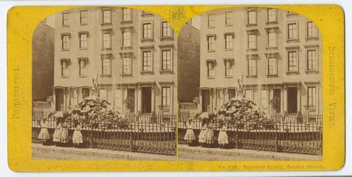Keywords: stereographs streets spring garden street springgardenstreet fountains girls Shows a large fountain in front of a residence on Spring Garden Street, Philadelphia, ca. 1870s. Four girls in elegant attire look at the fountain from outside of the iron-work fence that surrounds the water feature. Accession number: P.2011.47.1943 Shows a large fountain in front of a residence on Spring Garden Street, Philadelphia, ca. 1870s. Four girls in elegant attire look at the fountain from outside of the iron-work fence that surrounds the water feature. Accession number: P.2011.47.1943