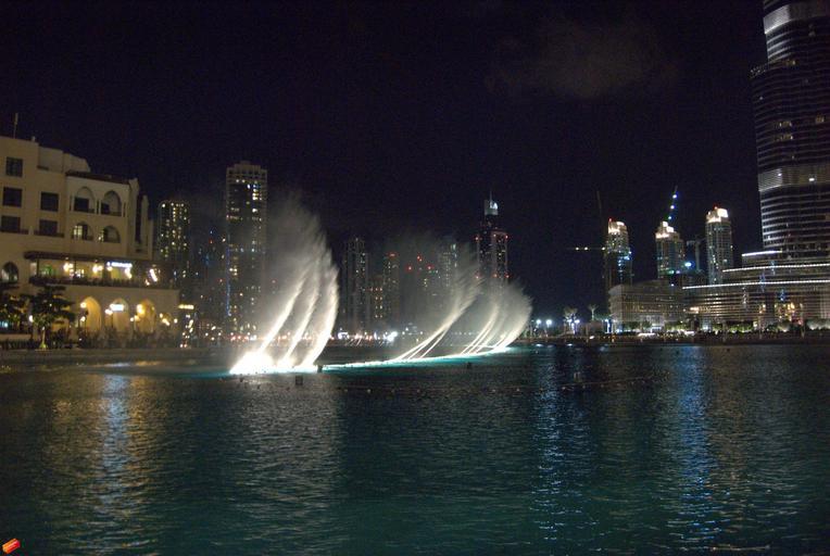 Keywords: fountain water fountain city decorative fountains dubai lights architecture building outside evening night landmark beautiful sidewalk artistic