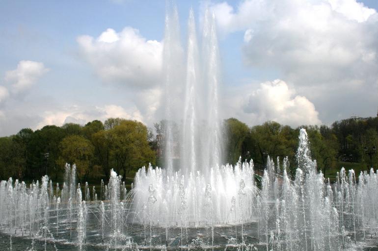 Keywords: fountain water spout spray white trees clouds and sky