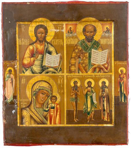 | Keywords: Four part icon.jpg  en Four part icon Christ Pantocrator St Nicholas the Wonderworker Mother of God of Kazan and Selected Saints Tempera on woodpanel Russia early 19th century 35 5x27 ru ICON ЧЕТЫРЕХЧАСТ АЯ ИКО А СПАС ВСЕДЕРЖИТЕЛЬ СВЯТОЙ  ИКОЛАЙ ЧУДОТВОРЕЦ БОГО АТЕРЬ КАЗА СКАЯ ИЗБРА  ЫЕ СВЯТЫЕ Россия  ачало 19 в Темпе а де ево Разме а 35 5х27 см Early 19th century https //www bukowskis com/en/auctions/F171/229-ikon Bukowskis author other versions PD-Art Uploaded with UploadWizard Icons of Christ Pantocrator Saint Nicholas Our Lady of Kazan |