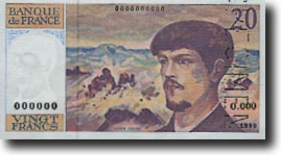 Keywords: FRA-20f-anv.jpg en 20 francs es 20 francos Banque de France banknote Monnaie de Paris banknote European Central Bank photograph PD-JORF-nor-conso Money-FR Banknotes of France 002001997 a R Claude Debussy Banknotes with a face value of 20