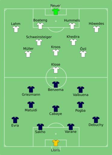 | Keywords: FRA-GER 2014-07-04.svg 2014 FIFA World Cup quarter-final match between France and Germany quarts de finale de la Coupe du monde de football 2014 entre la France et l'Allemagne 2014-07-04 18 59 38 own <br />Line-ups http //resources fifa com/mm/document/tournament/competition/02/39/89/51/eng_58_0704_fra-ger_tacticalstartlist pdf Davykamanzi cc-zero Uploaded with UploadWizard FIFA World Cup 2014 line-ups Germany national football team line-ups France national football team line-ups Germany at the 2014 FIFA World Cup FIFA World Cup 2014 group G France at the 2014 FIFA World Cup |