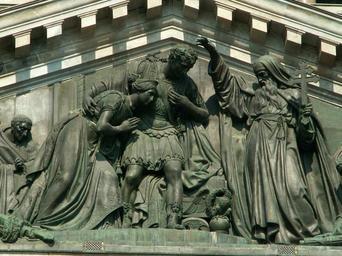 Keywords: Fragment of west barelief on St.Isaac cathedral.jpg Fragment of Ivan Vitali's relief St Isaac blessing the Emperor Theodosius and his wife Flaccilla on the west front of Saint Isaac's cathedral Saint Petersburg Russia Ф агмент ельефа «Вст еча Исаакия Далматского с импе ато ом Феодосием» на западном ф онтоне Исаакиевского собо а Санкт-Пете бу г Россия own 2006-05-01 User LoKi Ivan Vitali Saint Isaac's Cathedral - Western Facade Pediments of Saint Isaac's Cathedral Isaac of Dalmatia Theodosius I 2006 in Saint Petersburg |