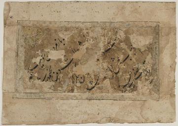 Keywords: Fragmentary Verses WDL6836.png Artwork ru аль-Хусайни Сафи fr al-Housseini Safi en al-Husayni Safi zh 萨菲·侯赛尼 pt al-Husayni Safi ar الحُسيني، صافي es al-Husayni Safi ru Ф агменты стихов fr Versets fragmentaires en Fragmentary Verses zh 残缺不全的诗句 pt Versos fragmentários ar قصائد متفرقة ru Данный ф агмент с об азцами каллиг афического письма находится в очень плохом состоянии Четы е стиха из пе сидской поэзии п е ываются несколькими большими ды ами в бумаге Тем не менее несколько слов все же можно азоб ать Я хочу снова увидеть твое лицо / Лицез ение твоей к асоты сделало меня богатым / Рука без конца / Их п исутствие адовало мне душу и глаз В п авом ве хнем углу наклеена золотистая панель а в п авом нижнем углу указано сок ащенное имя каллиг афа  Сафи аль-Хусайни Д угие аботы этого каллиг афа неизвестны Возможно он аботал в Пе сии или Индии п иблизительно в XVI столетии или позже <br>Каллиг афия пе сидская; Иллюмини ование укописей; Пе сидская поэзия; Поэзия fr Ce fragment de calligraphie est en très mauvais état Les quatre versets de poésie persane sont interrompus par de grands trous dans le papier Toutefois quelques mots sont encore lisibles  « Je veux revoir ton visage / voir ta beauté fait ma fortune / Main sans fin / leur présence a rendu mon cœur et mes yeux contents  » Un panneau doré collé est présent dans le coin supérieur droit alors que le coin inférieur droit contient le nom tronqué du calligraphe Safi al-Housseini Le calligraphe est autrement inconnu ; il peut avoir été actif en Perse ou en Inde durant ou après le XVI<sup>e</sup> siècle <br>Calligraphie persane; Enluminures; Poésie persane; Poésie en This calligraphic fragment is in very poor condition The four verses of Persian poetry are interrupted by a number of large holes in the paper A few words are still legible however   I want to see your face again / Seeing your beauty made my fortune / Hand without end / Their presence made my heart and eye happy In the upper-right corner appears a pasted gold panel while the lower-right corner contains the truncated name of the calligrapher Safi al-Husayni This calligrapher is otherwise unknown; he may have been active in Persia or India sometime during or after the 16th century <br>Calligraphy Persian; Illuminations; Persian poetry; Poetry zh 此书法残卷的状况 常糟糕 纸张上 大量破洞,四行波斯诗句显得七零八落 但是, 几句 仍然清晰可辨: 我想再次 到你的脸/ 到你的美丽 是我命运的转折点/手 没 尽头/它们的存 让(我)心情愉悦 上 梢 右上角 个粘贴的金色边框, 右下角则 书法家萨菲·侯赛尼 Safi al-Husayni 残缺的名字 此书法家的其他情况不明,他可能 16 世纪的某个时间或之后活跃 波斯和印度 <br>书法,波斯语; 插图; 波斯诗歌; 诗歌 pt Este fragmento caligráfico está em condições muito ruins Os quatro versos de poesia persa não podem ser lidos por completo devido a vários buracos grandes no papel No entanto ainda há algumas poucas palavras legíveis   Eu quero ver teu rosto novamente / Ver tua beleza fez minha fortuna / Mão sem fim / A presença deles alegrou meu coração e meus olhos Colado no canto superior direito há um painel dourado enquanto no canto inferior direito há o nome truncado do calígrafo Safi al-Husayni parte esta menção o calígrafo é desconhecido; ele pode ter estado em exercício na Pérsia ou na Índia em algum momento durante ou após o século XVI <br>Caligrafia persa; Iluminuras; Poesia persa; Poesia ar هذه القطعة الخطية في حالة يُرثى لها فأبيات الشعر الفارسي الأربعة يعترضها عدد من الثقوب الكبيرة على الورق وعلى الرغم من ذلك، فهناك بضع كلمات لا تزال مقروءة أريد ان أرى وجهك مرة أخرى\رؤية جمالك صنعت ثروتي\يد بلا نهاية\وجودهم يجعل قلب ي وعيني يخفقان من السعادة تَظهر في الركن الأيمن العلوي لوحة ذهبية مُلصقة، بينما يوجد بالركن الأيمن السفلي الاسم المبتور للخطاط، وهو صافي الحسيني وماعدا نسبة هذه القطعة إليه، فإن هذا الخطاط ليس معروفاً، وربما عمل في بلاد فارس أو الهند في وقت ما أثناء أو بعد القرن السادس عشر <br>الخط، الفارسي; الزخارف; الشعر الفارسي; الشعر es Este fragmento de caligrafía está en muy mal estado Los cuatro versos de poesía persa están interrumpidos por una serie de grandes agujeros en el papel Sin embargo todavía se pueden leer algunas palabras «Quiero ver tu rostro de nuevo / Ver tu belleza hizo mi fortuna / Mano sin fin / Su presencia brindó felicidad a mi corazón y a mi vista» En la esquina superior derecha aparece un panel dorado pegado mientras que la esquina inferior derecha contiene el nombre truncado del calígrafo Safi al-Husayni Por lo demás este calígrafo es desconocido puede haber estado en actividad en Persia o en la India en algún momento durante o después del siglo XVI <br>Caligrafía persa; Iluminaciones; Poesía persa; Poesía 1500 1599 ru Рукописи fr Manuscrits en Manuscripts zh 手稿 pt Manuscritos 