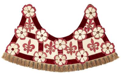 Keywords: Framdel till tornerschabrak i Maria Eleonoras färger rött och vitt tillverkat för bröllopstorneringen 1620 - Livrustkammaren - 91557.tif LSH artwork Baltzar Dinet Hovskräddare Anders pärlstickare pärlstickare sv På en botten av vit taft är applicerade ca 65 mm breda röda sammetsremsor tagna på diagonalen i ett rutsystem Där remsorna korsar varandra är applicerad en dubbel blomma av sidenatdlas den undre röd och ca 180 mm i diameter den övre vit och ca 140 mm På varje ruta en stiliserad lilja ca 90 mm hög och 160 mm bred En rosett av ibland guldgalon och ibland av silvergalon i blommornas mitt saknas på fyra blommor och två liljor Applikationera kantade med 3 mm breda silverflätor <br/>Längs nedre kanten en 100 mm bredfrans av silver och brunt silke i ca 25 mm breda partier <br/>Mellanfoder och foder av svart linne i tuskaft En ca 270 mm bred styvnad längs nedre kanten På fodrets övre vänstra hörn ett ca 500 mm långt beige bomullsband i övre högra hörnet en ca 250 mm lång läderrem <br/>1654 finns dessa tolv tornertäcken i Livrustkammaren 1655 även halskapporna och 1671 riddarskörten Ett täcke och riddarskörten kasserades 1823 1850 finns de ej upptagna 1867 upptages två med anteckning från Gripsholm ett är upptaget tillsammans med en sadel 869 övriga återlämnas från Husgerådskammarens förråd på Gripsholm enl skrivelse från chefen för K Hovmarskalksämbetet 7 2 1912 original caption Framdel till tornerschabrak i Maria Eleonoras färger rött och vitt tillverkat för bröllopstorneringen 1620 <br/> Nyckelord Sidentaft Blommor Blommigt Röd Vit 1600-tal Stormaktstiden Hästutrustning Tornering Tyg Textilier Bröllop Föremålsbild Schabrak Gustav II Adolf och Maria Eleonoras bröllop 1620 taffeta Färg vit röd material sidentaft size mm 450 mitt size mm 850 kant size mm 1260 upptill size mm 1480 nedtill LRK Maria Eleonora av Sverige drottning 1599- Königsberg Trofast - hov och tass i kunglig tjänst 2010-2011 Livrustkammaren Trogna vänner - Kungliga hästar och hundar 2011-2012 Museiverket/Finlands nationalmuseum Maria Eleonora - Hjärtats drottning 2013 Livrustkammaren Maria Eleonora - Hjärtats drottning arb namn 2014-2015 Nyköpingshus place of origin original filename lm_dig8720 42653 inventory number LRK 6114 91557 CC-BY-SA Erik Lernestål <gallery caption Different images of same object > File Framdel till tornerschabrak i Maria Eleonoras färger rött och vitt tillverkat för bröllopstorneringen 1620 - Livrustkammaren - 91558 tif File Framdel till tornerschabrak i Maria Eleonoras färger rött och vitt tillverkat för bröllopstorneringen 1620 - Livrustkammaren - 91559 tif </gallery> Horse equipment Sweden 1611-1718 Flowers in art Textiles Floral designs Red and white Wedding of Gustav II Adolf and Maria Eleanor of Sweden Erik Lernestål Media contributed by LSH dim-with multiple size templates Media contributed by LSH unmatched creator Media contributed by LSH unmatched keyword Media contributed by LSH 2014-11 |