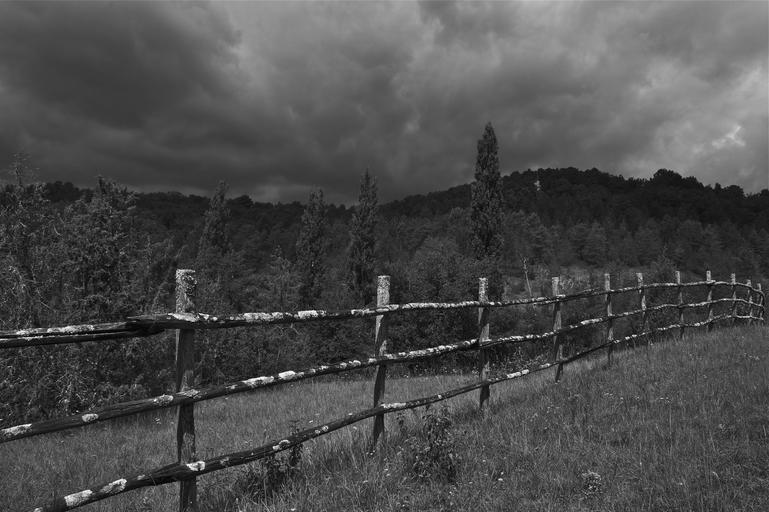 Keywords: france landscape scenic forest trees fence countryside sky clouds nature outside black and white