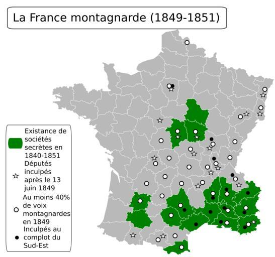 Keywords: France montagnarde 1849-1851.svg fr La France montagnarde 1849-1851 Travail personnel d'après Raymond Huard La révolution de 1848 en France et en Europe éditions sociales p 41 Romain0 02 02 2011 Cc-zero French Second Republic Political parties established in 1848
