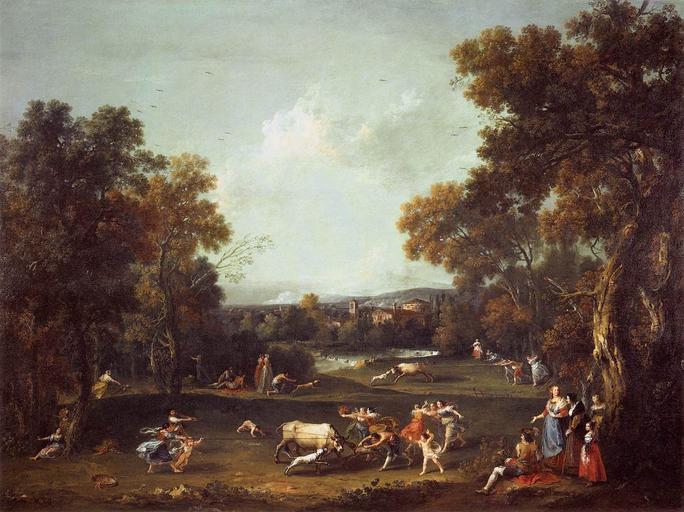 | Keywords: Francesco Zuccarelli - Bull-Hunting - WGA26011.jpg ca 1736 Oil on canvas size cm 114 150 Institution Gallerie dell'Accademia Venice object history credit line accession number WGA link 26011 http //www wga hu/art/z/zuccarel/bullhunt jpg http //www wga hu/html/z/zuccarel/bullhunt html PD-old-100 painting landscape Italian 1701-1750 Francesco Zuccarelli Italian paintings in the Accademia Galleries Venice 1730s paintings from Italy WGA form painting WGA type landscape WGA School Italian WGA time period 1701-1750 Paintings of landscapes with hunters 1730s paintings in Italy Paintings of hunting Bulls in art |