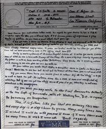 Keywords: francis smith francissmith the hump thehump air transport command airtransportcommand china text document writing Francis Smith (1917 - 1998) was an aviator and instructor. Obtaining his license in 1935, he was a pilot for numerous flying services doing crop dusting, charters and instructing. Mr. Smith instructed RAF pilots during WW II, and served with the Air Transport Command, flying the "Hump" between India and China. He was discharged in 1946. Mr. Smith continued flying in aerobatics, crop dusting, charter and airline pilot until his employment with the FAA from 1962 to his retirement in 1975. Repository: San Diego Air and Space Museum Archive Francis Smith (1917 - 1998) was an aviator and instructor. Obtaining his license in 1935, he was a pilot for numerous flying services doing crop dusting, charters and instructing. Mr. Smith instructed RAF pilots during WW II, and served with the Air Transport Command, flying the "Hump" between India and China. He was discharged in 1946. Mr. Smith continued flying in aerobatics, crop dusting, charter and airline pilot until his employment with the FAA from 1962 to his retirement in 1975. Repository: San Diego Air and Space Museum Archive |