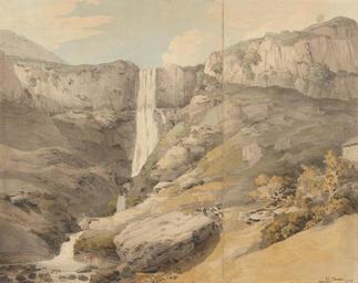 Keywords: Francis Towne - View of the Rhydaer - Google Art Project.jpg <nowiki>Inscribed in brown ink lower right F Towne delt 1777 No 6 ; in brown ink verso upper center Distyll y Rhaiadr The stream divides the country's of Denbighshire Montgomery the Lordship of Paris Chisk the perpendicular height from which it falls is 240 feet Drawn 1777 by Francis Towne </nowiki> Inscription _Marks Watermark Fleur-de-lis similar to Heawood 1849 Inscription _Signed_and_Dated <nowiki>Signed and dated in brown ink lower right F Towne delt 1777 No 6 </nowiki> Not on view Watercolor and black ink over graphite on medium slightly textured cream laid paper cattle rocks cliff waterfall mountain landscape special url_id IQElQciU8B624w PD-old-100-1923 1816 Francis Towne Google Art Project works by Francis Towne Waterfalls in art Pistyll Rhaeadr 1777 drawings 18th-century landscape drawings Landscape paintings of Wales |