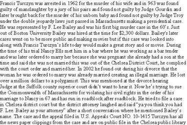 Keywords: Francis turczyn.jpg en Francis Turczyn was arrested in 1962 for the murder of his wife docket numbers for manslaughter 12/10/1962 281924ZZ BO 281925ZZ 10/31/1963 NG and in 963 was found guilty of manslaughter by a jury of his peers and found not guilty by Judge Gourdin and later brought back for the murder of his unborn baby and found not guilty by Judge Troy under the double jeopardy laws just passed in Massachusetts making a presidential case He was represented by F Lee Bailey and was his first big murder case in the 60 ™s Just out of Boston University Bailey was hired at the time for 2 300 dollars Bailey's later cases went on to be more public and making movies but if this case was looked into along with Francis Turczyn ™s life today would make a great story and or movie During the time of his trial Nancy Ells met him in a bar where he was working as a bar tender and was later ordered to marry her because she was pregnant she already had a son at the time and said she was not married this was out of the Chelsea District Court he complied with the court order and married her In 2002 he found out during his divorce that the woman he was ordered to marry was already married creating an Illegal marriage He lost over a Million Dollars to a Polyandrist This was mentioned at the divorce hearing Judge at the Suffolk county superior court didn ™t want to hear it Now he ™s trying to sue the Commonwealth of Massachusetts for violating his civil rights in the order of his marriage to Nancy in 67 and has run in road block after road block He tried to file a case in Chelsea district court but the district attorney laughed and said ya you think you had F Lee Bailey as your attorney after a short conversation where he mentioned Bailey ™s name The case and the appeal filed in U S Appeals Court NO 10-1415 Turczyn has all the news paper clippings from the case and are on public file in the Chelsea public library The case was later dismissed for lack of jurisdiction Turczyn refiled in the suffolk superior court docket number 2010-02529D and is under review Source own Francisturczyn1 2010-05-02 Texts |