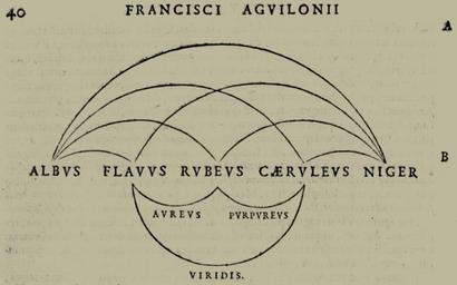 Keywords: Franciscus Aguilonius color scheme.png en The 1613 RYB color scheme of Franciscus Aguilonius Francisci Agvilonii with primaries yellow flavus red rubeus and blue caeruleus arranged between white albus and black niger with orange aureus green viridis and purple purpureus as combinations of two primaries 1613 https //books google com/books id Y2BDAAAAcAAJ pg PA40 v onepage q f false Franciscus Aguilonius other versions PD-old-70-1923 RYB |