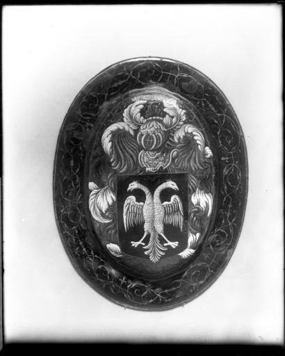 Keywords: François Limosin III - The Last Supper - Walters 44183 - Reverse.jpg The scene occupies the well of the dish Christ is surrounded by the apostles Bread wine cups and a dish containing the roasted paschal lamb are laid on the table which is covered with a white linen cloth The black background is powdered with gilt punched dots and stars The cavetto is decorated with gilt scrolls on a black ground The rim displays eight cherub heads painted amidst gilt scrolls In the central field of the reverse of the dish is a large shield-of-arms sable a double-headed eagle displayed argent surmounted by a closed helm and colletin with a crest with mantling in blue white and orange The border is decorated with gilt scrolls middle Other date century 17 technique painted enamel copper cm 38 8 30 1 accession number 44 183 10277 Vicomte Deury date and mode of acquisition unknown Sale Arras June 14-21 1897 lot 58 Jacques Seligmann Paris date and mode of acquisition unknown Henry Walters city Baltimore Walters Art Museum Henry Walters Acquired by Henry Walters 1902 Signature in black near the edge of the table franciscus limosin fecit Transcription in the black background COENA DOMINI place of origin Limoges France Walters Art Museum license Limoges painted enamels in the Walters Art Museum Media contributed by the Walters Art Museum needs category review Painted enamel art in the Walters Art Museum François Limosin III |