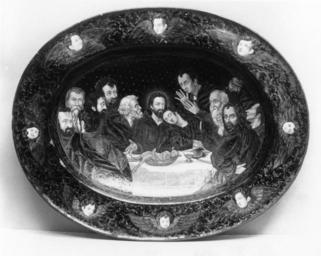 Keywords: François Limosin III - The Last Supper - Walters 44183.jpg The scene occupies the well of the dish Christ is surrounded by the apostles Bread wine cups and a dish containing the roasted paschal lamb are laid on the table which is covered with a white linen cloth The black background is powdered with gilt punched dots and stars The cavetto is decorated with gilt scrolls on a black ground The rim displays eight cherub heads painted amidst gilt scrolls In the central field of the reverse of the dish is a large shield-of-arms sable a double-headed eagle displayed argent surmounted by a closed helm and colletin with a crest with mantling in blue white and orange The border is decorated with gilt scrolls middle Other date century 17 technique painted enamel copper cm 38 8 30 1 accession number 44 183 10277 Vicomte Deury date and mode of acquisition unknown Sale Arras June 14-21 1897 lot 58 Jacques Seligmann Paris date and mode of acquisition unknown Henry Walters city Baltimore Walters Art Museum Henry Walters Acquired by Henry Walters 1902 Signature in black near the edge of the table franciscus limosin fecit Transcription in the black background COENA DOMINI place of origin Limoges France Walters Art Museum license Limoges painted enamels in the Walters Art Museum François Limosin III Painted enamel art in the Walters Art Museum Last Supper François Limosin III |