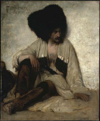 | Keywords: Frank Duveneck - Caucasian Soldier.jpg Artwork Creator Frank Duveneck 1870 oil canvas cm 128 27 105 41 institution Museum of Fine Arts Boston Gallery 233 object history Provenance 1870 the artist; with Doll and Richards Boston; 1875 Miss Alice Hooper Boston; 1876 gift of Miss Alice Hooper to the MFA Accession Date May 11 1876 credit line Gift of Miss Alice Hooper Upper left F DUVENECK/Munich 1870 accession number 76 296 http //www mfa org/collections/object/a-circassian-30883 Museum of Fine Arts Boston http //images lunaimaging com/images/AMICA/Size4/2010/bmfa c25061 jpg PD-old-auto-1923 1919 Frank Duveneck Paintings in the Museum of Fine Arts Boston 1870 oil on canvas paintings in the United States 19th-century oil paintings of sitting men at full length Nations of Russian Empire in art Papakhi |