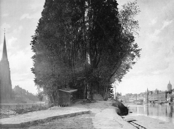 | Keywords: Frankfurt Am Main-Fay-BADAFAMNDN-Heft 26-Nr 311-1911-Maininsel von der Inseltreppe gesehen.jpg Follows de Heft 26 Tafel 311 / Titel auf der Tafel Maininsel von der Inseltreppe gesehen / Originalbeschreibung Zu den Denkmälern der alten Reichsstadt die durch Geschichte und Sage verklärt bestimmt sind für ewige Zeiten im Gedächtnis der Menschen fortzuleben gehört die žrote Mainbrücke Aus Mainsandstein errichtet auf massiven Pfeilern mit kräftigen Vorder- und Hinterköpfen die zwischen dem 5 und 7 Bogen eine architektonisch recht wirksame Ausbuchtung erfahren haben überspannt sie in halbkreisförmigen Bogen aus Quaderschichten den ruhig dahinströmenden Flusslauf Ueber das Alter sind wir nur schlecht unterrichtet Die erste urkundliche Erwähnung der alten Brücke geschieht im Jahre 1222 doch ist mit Sicherheit anzunehmen dass die Erbauung einer Holzbrücke in weit frühere Zeit hinaufreicht Mau kann sich kaum vorstellen dass die ansehnliche Niederlassung um den žSaalhoeff das alte Palatium Ludwigs des Frommen nicht schon sehr bald mit den ausgedehnten Wohnsitzen der Ministerialen in der Sachsenhäuser Gemarkung in direkter Verbindung gestanden hat Allein die Unsolidität des Materials und die rohe Naturgewalt worunter die Menschheit des Mittelalters in ganz anderer Weise zu leiden hatte als wir in unseren Tagen zwangen zu dem kostspieligen Ersatzbau in Stein Doch brachten Mangel an Mittel wie auch die Schwierigkeit geeignete Arbeitskräfte zu finden das monumentale Werk nur langsam voran Man fundierte die Pfeiler unmittelbar mit Hülfe von eichenen Schwellenrosten auf die Flusssohle die nicht etwa wie irrtümlich angenommen wird aus Tonschiefer sondern aus blauem Cyrenenmergel besteht der bei der verstärkten Strömung zwischen den Pfeilern den wachsenden Auskalkungen der Sohle nicht genügenden Widerstand entgegensetzt So wird denn im Laufe des 13 und 14 Jahrhunderts wiederholt von ausgeführten Steinarbeiten an Pfeilern und Schwibbogen berichtet Auch für König Heinrich den Sohn Friedrichs II bildete die Erhaltung der Brücke im Interesse des Reiches einen Gegenstand schwerer Sorge Der aus politischen Gründen vor allem den Städten wohlgesinnte junge Fürst verlieh im Jahre 1235 ein Privilegium zur halben Nutzung der Münze und zum Bezug des zur Reparatur der Brücke nötigen Holzes aus dem Reichswalde Auf das höchste bedroht muss aber die Erhaltung der Brücke um das Jahr 1300 gewesen sein Anders hat es keinen Sinn dass fünfzehn italienische Bischöfe einen Ablass für jene Gläubigen gewähren die zum Bau der vom Hochwasser zerstörten Pfeiler beitrugen Die Brückenbahn bestand zu jener Zeit zum grössten Teil aus Holz und gab dem Bauwerk noch nicht durch die eigene Schwere der gewaltigen Schwibbogen eine Stabilität die allen Unbilden der Witterung bis zum heutigen Tage getrotzt und entgegen den gemachten Einwänden auch für absehbare Zukunft noch trotzen würde Immerhin mag die Brücke im Jahre 1405 wie die Abbildung von dem Schreiber eines Bedebuches zeigt das heutige Aussehen gehabt haben Wenn dennoch aus dem Jahre 1419 berichtet wird dass man an dem letzten Pfeiler gearbeitet habe damit mam fernerhin ždes kostlichen buwes mit holczwercken nit bedarff sondern balken druber leget und druff brückendele so handelt es sich hier um die Beseitigung eines Zustandes den man im Hinblick auf unruhige Zeiten belassen hatte um gegebenen Falles ohne weitere Schwierigkeiten die Verbindung der beiden Flussufer aufzuheben Einen gewissen Schutz gewährte immer noch der über zwei Oeffnungen belassene Brückenbelag aus Bohlen der erst Ende des 16 Jahrhunderts durch Bogen am Sandstein ersetzt wurde Und böse Zeiten zogen für das ehrwürdige Denkmal herauf Im Jahre 1427 sah sich der Rat der freien Reichsstadt genötigt aus Furcht vor den wilden Horden der Hussiten die Bogen der Brücke mit schweren Balken versperren zu lassen Den Einspruch des in seinen Fluss- und Hoheitsrechten sich beschränkt glaubenden Erzbischhofs von Mainz nahm man leicht Etwa 100 Jahre später aber während der Bewegung des Bauernaufstandes der auch in das Maintal hinüber gegriffen hatte pflanzte die ärmere Bevölkerung der Stadt die Fahne der Empörung auf der Brücke auf ohne dass es jedoch zu ernsthafteren Zusammenstössen gekommen war Schlimmer erging es dem Bauwerk im schmalkaldischen Kriege Als das Protestantenheer zur Belagerung der damals in kaiserlichem Besitz sich befindenden Reichsstadt schritt hatte man alle Vorkehrungen zum Schutze des unentbehrlichen Verkehrsweges getroffen Grosse Leinentücher waren auf der Brücke gespannt und die Mühle selbst mit grossen Wollsäcken verstopft um sie während der Zeit der Bedrängnisse in Gang zu halten Der Hauptanschlag zur Zerstörung der Brücke vermittels schweren Geschützes vereitelte der Abschluss des Passauer Vertrages und der damit verbundene Abzug eines Teiles der Belagerungstruppen Kaum weniger ernst war die Lage der Brücke im dreissigjährigen Kriege Auf der Fahrbahn selbst kam es zu heftigem Kampfe und es muss als ein Wunder angesehen werden dass bei dem Geschützfeuer von Ufer zu Ufer wobei 26 Häuser in Asche gelegt wurden die Brücke selbst kaum wesentlichen Schaden erlitt Allein an dem Kruzifix seien wie die Ueberlieferung will noch heute die Spuren von Schwedenkugeln sichtbar Im siebenjährigen Kriege wie im Befreiungskriege hat ein günstiger Stern über der Stadt gewaltet und grössere Verluste ferngehalten Im Sturmjahre 1848 sah die Brücke die letzten kriegerischen Ereignisse die aber Spuren irgendwelcher Art an dem Denkmal nicht hinterlassen haben <br>Wie in Kriegszeiten so stand auch in den Jahren des Friedens die alte Mainbrücke im Mittelpunkt des Interessens der Bewohner Ein gewaltiger Menschenstrom zog jahraus jahrein auf uralten Handelswegen über die Brücke die zur Lebensader des Rhein- und Main-Gaues geworden war Durch besondere Gesetze geschützt bedrohte man einen jeden der auf der Brücke Streit anfing mit dem Ab