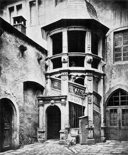 Keywords: Frankfurt Am Main-Roemer-Roemerhoefchen-Alt-Limpurg vor Umbau 1889.jpg Renaissance-Treppenturm des Hauses Alt-Limpurg Scan der Offsetwiedergabe einer Fotografie vor 1891 Der an der westlichen Hofseite des Hauses Alt-Limpurg anschließende Treppenturm aus dem Jahr 1627 ist bis heute erhalten und stellt eines der wenigen ganzheitlichen Bauteile des Römerkomplexes dar dass die massiven Kriegszerstörungen überstand Da das Haus Alt-Limpurg bis 1878 der gleichnamigen Ganerbschaft gehörte trennte eine hohe Mauer die südliche Seite des heutigen Römerhöfchens von der Nordseite mit den Römerwachen die schon seit dem Mittelalter der Stadt gehörte Nach dem Kauf des Hauses Alt-Limpurg durch die Stadt wurde die Mauer obsolet und 1891 niedergelegt das Foto ist also ein rares Zeugnis dieses noch weitgehend mittelalterlichen Bauzustandes Urheberrechtliche Ansprüche dürften aufgrund des Alters erloschen sein PD-old Haus Alt-Limpurg 1889 in Frankfurt am Main Stair towers Stairs in Hesse |