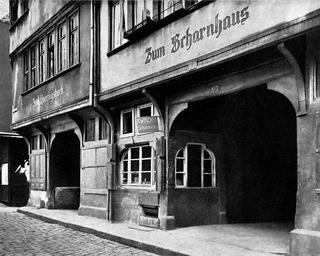 | Keywords: Frankfurt Am Main-Scharnhaeuser-Bendergasse-EG Detail.jpg Frankfurt on the Main Late-gothic ground floors of the houses Bendergasse Coopers Lane No 11 and 13 also known as Scharnhaeuser Scharn Houses in the Altstadt Old Town Frankfurt am Main Spätgotische Erdgeschosse der als Scharnhäuser bekannten Gebäude Nr 11 und 13 in der Bendergasse der Altstadt Walter Sage Das Bürgerhaus in Frankfurt a M bis zum Ende des Dreißigjährigen Krieges Wasmuth Tübingen 1959 Das Deutsche Bürgerhaus 2 Creator Carl Andreas Abt around 1910 um 1910 PD-old Carl Andreas Abt Bendergasse Scharnhäuser 1910 in Frankfurt am Main 1910 |