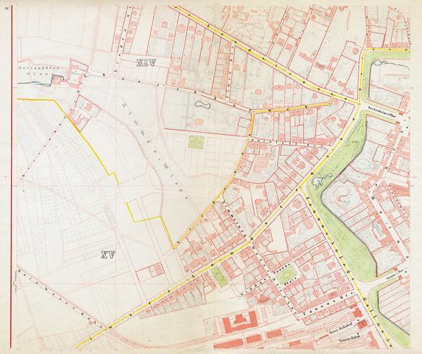 | Keywords: Frankfurt-Ravenstein1861-Bl4.jpg Ravenstein à bersicht Die neun Kartenblätter des vorgenannten Plans erschienen 1862 im Verlag des Geographischen Instituts zu Frankfurt am Main und sind der letzte große Plan der die Stadt noch völlig unberührt von den neuzeitlichen Straßendurchbrüchen darstellt; ausgenommen der Spindler-Plan von 1866 der jedoch nur fragmentarisch überliefert und somit unbrauchbar ist Was seinerzeit an Ravensteins Plan bemerkenswert war ist zum einen die Maßstabstreue die auf Grunlage eines mathematisch durchgerechneten Koordinatensystems erzielt wurde zum anderen die enorme Genauigkeit zeigt er doch jede einzelne Parzelle mit Hausnummer und benennt auch selbst kleinste Seitengassen Umso bemerkenswerter ist diese Leistung wenn man berücksichtigt dass der Plan noch größtenteils in Handarbeit und ohne moderne technische Hilfsmittel entstand Die Herstellung im chromolithograpischen Steindruckverfahren begründet zudem eine graphische Qualität die viele modernere Verfahren nie wieder erreicht haben Noch einige Worte zur Digitalisierung die heute bereits über 140 Jahre alten Pläne befanden sich zum Zeitpunkt der Digitalisierung August 2006 in einem bedauernswerten Zustand Die zeitgenössische Unsitte auf nicht säurefreiem Papier zu drucken hatte alle Blätter stark vergilben lassen eine unangemessene Lagerung der Pläne vermutlich während Kriegszeiten zu deren Schutz liess Feuchtigkeit in das Papier einziehen was wiederum zu Schimmelbildung in Form von teils starker Stockfleckigkeit führte Außerhalb industrieller Anwendungen fand sich weiter keine bezahlbare Möglichkeit der direkten Digitalsierung der etwas unter A2 großen Blätter Daher wurden diese jeweils in zwei Stücken mit einem A3-Scanner bei 600 DPI gescannt und anschließend mit einer für Fotopanoramen gedachten Software wieder zusammengefügt Anschließend erfolgten händische Retuschen aller Blätter ein digitales Entrauschen der sich aufgrund der hohen Auflösung zeigenden Papierstruktur und eine anschließende Farbkorrektur die einen Großteil der durch Vergilben verursachten Farbabweichungen beheben konnte Zuletzt wurden von den über 120 Megapixel großen Einzelblättern JPEGs mit 4000 Pixel Höhe gezogen da nur in dieser Auflösung eine Bildgröße um 5 MB gewährleistet ist; dies kann nur als Kompromiss gesehen werden da teilweise selbst bei Vollauflösung feinste Details wie Brunnen oder winzige Treppen in Hinterhöfen kaum erkennbar sind Bei Interesse an verlustlosen Originalen größeren Ausschnitten etc helfe ich http //de wikipedia org/wiki/Benutzer Doenertier82 natürlich jederzeit gerne aus Blatt 4 des Plans Mitte links Urheberrechtliche Ansprüche sind aufgrund des Alters erloschen PD-old August Ravensteins Geometrischer Plan von Frankfurt am Main B1 |