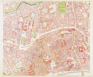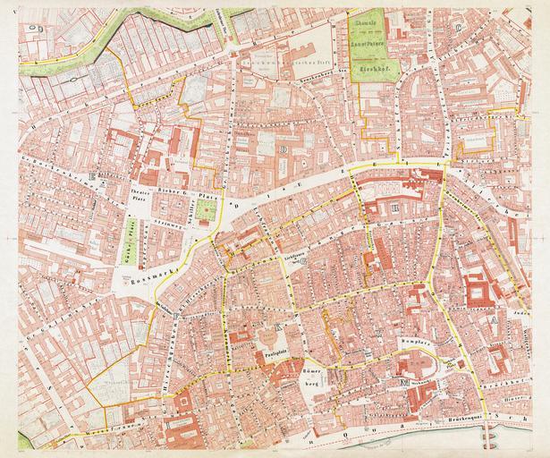 | Keywords: Frankfurt-Ravenstein1861-Bl5.jpg Ravenstein à bersicht Die neun Kartenblätter des vorgenannten Plans erschienen 1862 im Verlag des Geographischen Instituts zu Frankfurt am Main und sind der letzte große Plan der die Stadt noch völlig unberührt von den neuzeitlichen Straßendurchbrüchen darstellt; ausgenommen der Spindler-Plan von 1866 der jedoch nur fragmentarisch überliefert und somit unbrauchbar ist Was seinerzeit an Ravensteins Plan bemerkenswert war ist zum einen die Maßstabstreue die auf Grunlage eines mathematisch durchgerechneten Koordinatensystems erzielt wurde zum anderen die enorme Genauigkeit zeigt er doch jede einzelne Parzelle mit Hausnummer und benennt auch selbst kleinste Seitengassen Umso bemerkenswerter ist diese Leistung wenn man berücksichtigt dass der Plan noch größtenteils in Handarbeit und ohne moderne technische Hilfsmittel entstand Die Herstellung im chromolithograpischen Steindruckverfahren begründet zudem eine graphische Qualität die viele modernere Verfahren nie wieder erreicht haben Noch einige Worte zur Digitalisierung die heute bereits über 140 Jahre alten Pläne befanden sich zum Zeitpunkt der Digitalisierung August 2006 in einem bedauernswerten Zustand Die zeitgenössische Unsitte auf nicht säurefreiem Papier zu drucken hatte alle Blätter stark vergilben lassen eine unangemessene Lagerung der Pläne vermutlich während Kriegszeiten zu deren Schutz liess Feuchtigkeit in das Papier einziehen was wiederum zu Schimmelbildung in Form von teils starker Stockfleckigkeit führte Außerhalb industrieller Anwendungen fand sich weiter keine bezahlbare Möglichkeit der direkten Digitalsierung der etwas unter A2 großen Blätter Daher wurden diese jeweils in zwei Stücken mit einem A3-Scanner bei 600 DPI gescannt und anschließend mit einer für Fotopanoramen gedachten Software wieder zusammengefügt Anschließend erfolgten händische Retuschen aller Blätter ein digitales Entrauschen der sich aufgrund der hohen Auflösung zeigenden Papierstruktur und eine anschließende Farbkorrektur die einen Großteil der durch Vergilben verursachten Farbabweichungen beheben konnte Zuletzt wurden von den über 120 Megapixel großen Einzelblättern JPEGs mit 4000 Pixel Höhe gezogen da nur in dieser Auflösung eine Bildgröße um 5 MB gewährleistet ist; dies kann nur als Kompromiss gesehen werden da teilweise selbst bei Vollauflösung feinste Details wie Brunnen oder winzige Treppen in Hinterhöfen kaum erkennbar sind Bei Interesse an verlustlosen Originalen größeren Ausschnitten etc helfe ich http //de wikipedia org/wiki/Benutzer Doenertier82 natürlich jederzeit gerne aus Blatt 5 des Plans Mitte mittig Urheberrechtliche Ansprüche sind aufgrund des Alters erloschen PD-old derivative works Frankfurt-Ravenstein1861-Bl5 Auschnitt Friedberger-32 jpg August Ravensteins Geometrischer Plan von Frankfurt am Main B2 |